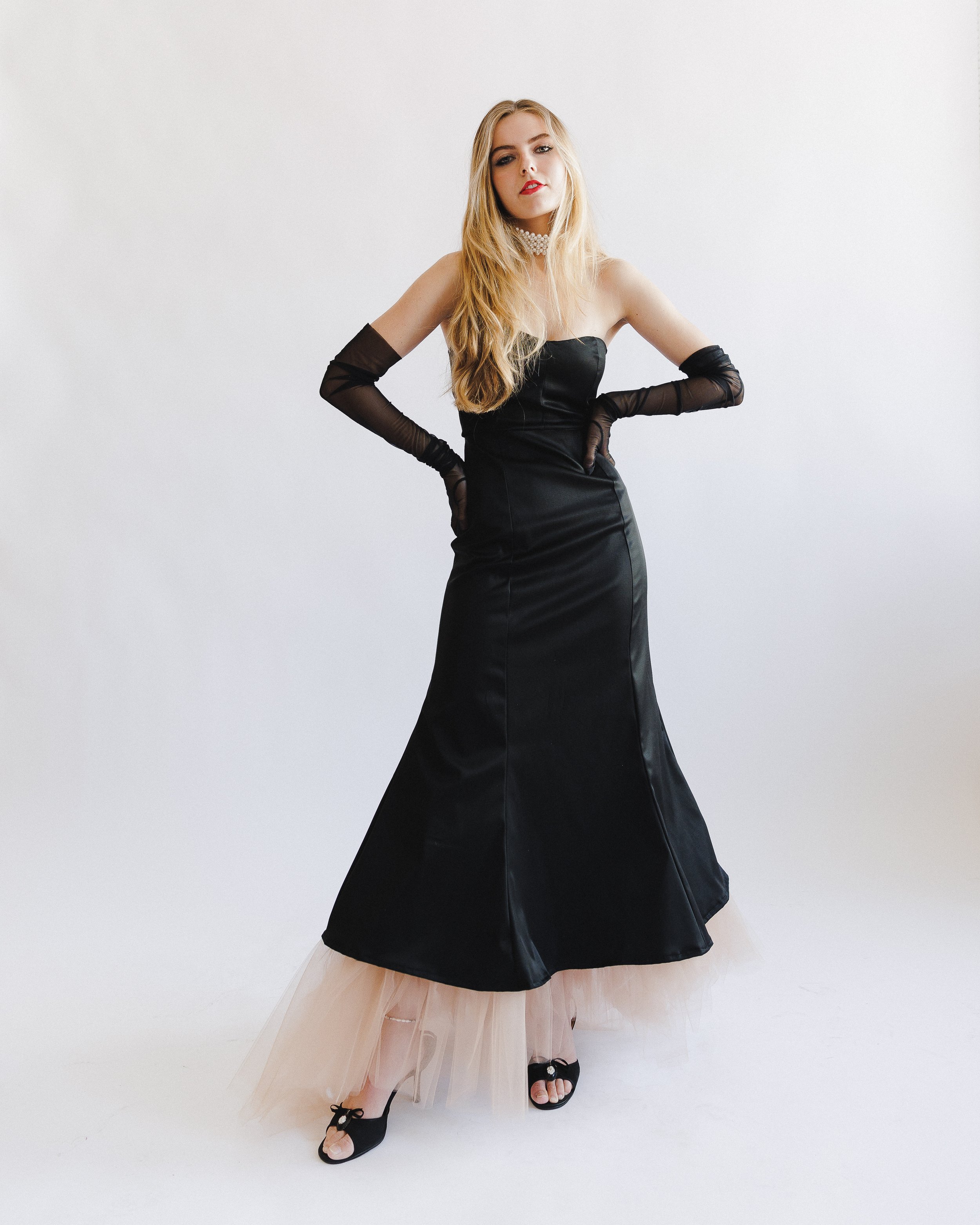the ava gownthis black strapless gown features a structured boned bodice, slimming waistline seam, and a trumpet skirt with layers of voluminous tulle beneath. The tulle was gathered by hand and attached to the hemline to create beautiful movement.